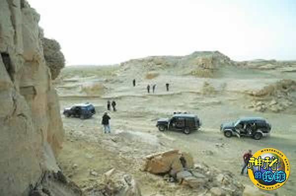 科考队考察雅丹地貌。左边一雅丹上有一老鹰的巢穴。
