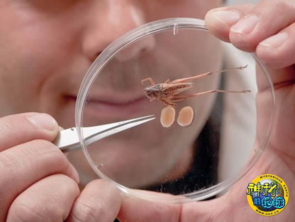 英国德比大学行为生态学家瓦赫德展示一只图伯鲁斯灌丛蟋蟀。这种蟋蟀学名“Platycleis affinis”,其相对于自身体重的睾丸尺寸是所有动物中最大的,重量占体重的14%。(图片提供:Richard Richards, University of Derby)