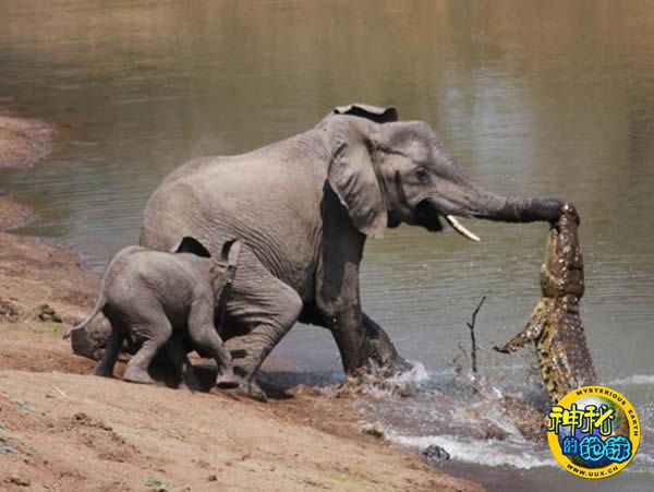 非洲伏兵(图片来源:Martin Nyfeler)和往来一样,两头非洲象来到水洼边喝水,但令它们没有想到的是,一只饥饿的尼罗鳄鱼就埋伏在水洼里并瞄准机会向它们展开攻击,一场生死较量就此展开。这场鳄象大战发生在赞比亚的南卢旺瓜河国家公园,来自瑞士克洛滕的游客马丁·奈菲勒拍下了全过程。奈菲勒在接受“国家地理新闻”网站采访时说:“我们看到一头母象和一头小象来到水洼边,然后就对导游说,真的太可爱了,我们在这停下来吧。突然间,鳄鱼跳了出来。整个过程可能持续了15秒。”