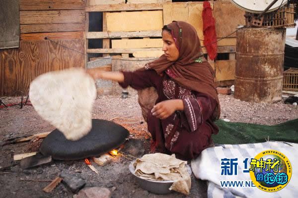在埃及西奈省边境重镇塔巴的一个小村庄,一名贝都因母亲用传统方式(倒扣铁锅)烙饼。