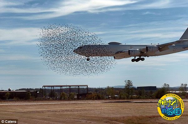 一架军用飞机在即将降落前忽然被一群鸟类瞬间席卷吞没,当时的情形看起来就像阿尔弗雷德•希区柯克的小说《群鸟》的场景一样。据称,这架美国海军飞机在临近阿肯色州史密斯堡地区机场的跑道时忽然惨遭鸟群突袭,不过这家飞机竟然奇迹般的毫无损伤幸免于难,更幸运的是,这架耗资8800万英镑的飞机E-6B的驾驶员面对鸟群围攻面无惧色,最终镇定自若的将飞机安全降落。