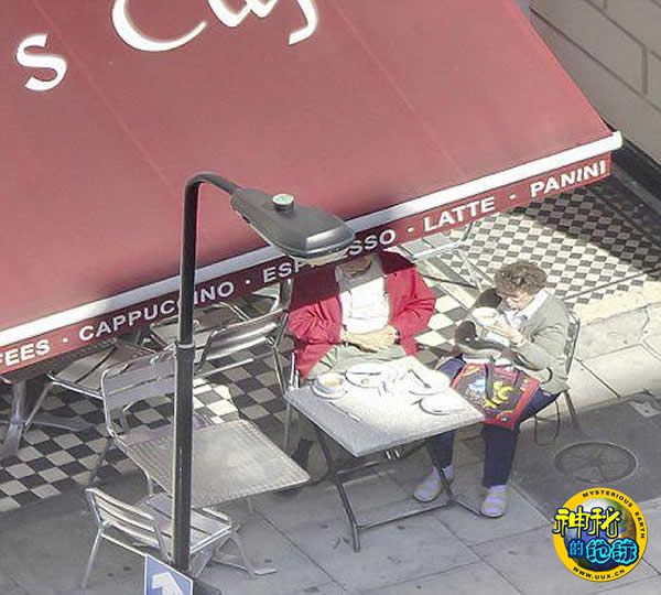 一对夫妇坐下来享受咖啡(左),他们并不知道已经被2英里(约合3.2公里)外的马丁定格在照片中。
