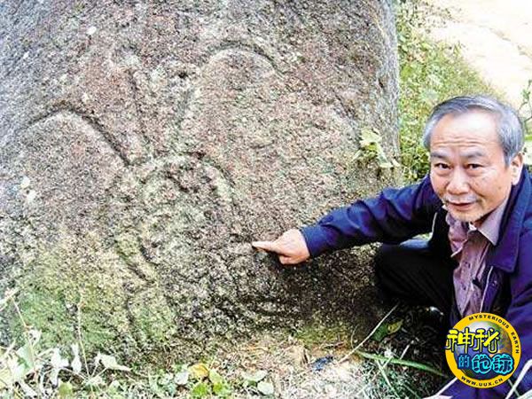 位于粤桂交界处偏僻山乡道路一侧的一块巨石上,近日发现一处罕见岩画,岩画中有人、马以及星座图案,还有一些类似文字的图案。特别令人惊奇的是一幅人像图案:头部似戴有“头盔”,头盔一左一右插有两根“羽毛”,中间一根天线状物。有专家认为此人像图案颇似影视中戴着头盔的外星人,也可能是古代百越土著首领图像,更有专家说,岩画是古代劳动人民确定时间和南位的定时定位器。据悉,该岩画已列入罗定市“第三次文物普查广东省重要文物新发现”。