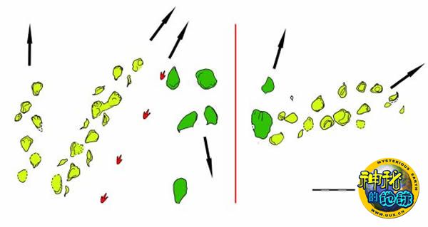 后来,唐永刚先生又在南面100多米冲沟的左上方,一块很大的紫色砂岩上发现了6个恐龙足迹,除了蜥脚类的足迹外,竟然还有兽脚类的足迹。他简直觉得自己中了头奖。虚骨类足迹在岩层上有4个连续分布,每个间隔60厘米,此脚印能明显看到前端的利爪印迹,5串足迹呈西南东北走向,足足有几十个。