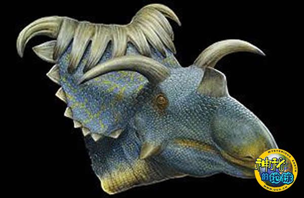 首先提醒读者注意,我们说的真正的角。华丽角龙(学名Kosmoceratops)生活在7600万年前,体重5500磅(约合2500公斤),栖息地位于现在的美国犹他州,其巨大的头部长有15个角。2007年犹他州大学在一次科学考察时发现了华丽角龙的骨骼化石,但直到2010年9月,科学家才正式描述这种恐龙并进行命名。骨骼化石分析结果让科学家感到吃惊,他们没有想到北美洲在6500万年前居然生活着这种奇特的恐龙。华丽角龙生活在沿岸地区,白垩纪西部内陆海道一带是它们的家。这条海道是一片面积巨大的水域,将大陆一分为二。