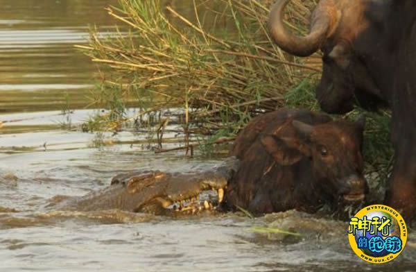 鳄鱼一口咬住了小水牛,正常情况下极具保护意识的牛群却对此无动于衷