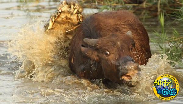 经过两个小时的拉锯战,鳄鱼紧紧咬住筋疲力尽的小水牛,将其拖入水中