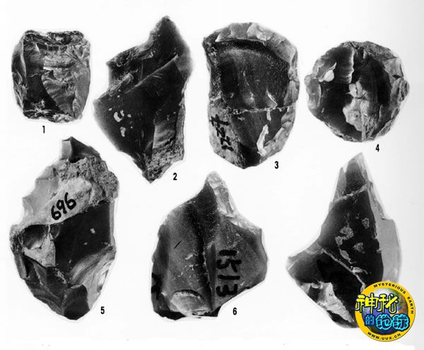 东方广场遗址出土的石器 1.两极石核; 2-5.刮削器;6.石钻; 7.雕刻器