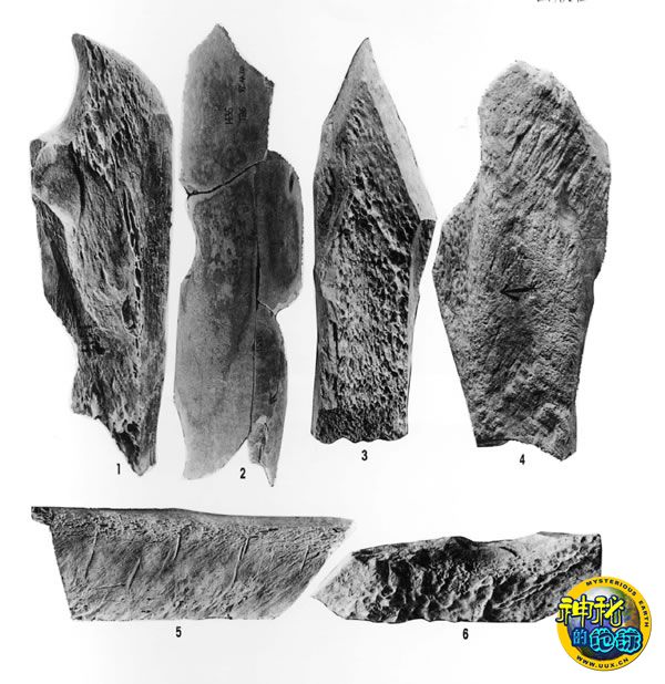 东方广场遗址出土的骨制品 1.骨铲;2.骨制品拼合; 3. 骨尖状器; 4. 骨器上的砍砸痕迹; 5. 骨头上的切割痕迹;6.骨刮削器;