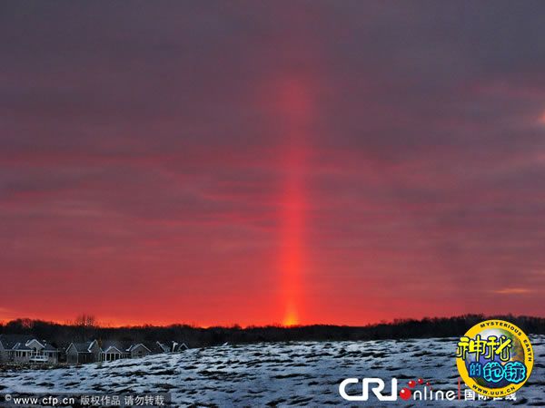 美国业余摄影师拍到自然界中非常罕见的“太阳穗” 来源: 蜘蛛网 时间:2010年12月16日 13:03 美国业余摄影师拍到自然界中非常罕见的“太阳穗” 2010年12月15日消息,美国业余摄影师Randy Knauf日前在密歇根州阿勒根拍摄到了这神奇的一幕。就像科幻电影中的场景一样,太阳的红色光芒似巨大的激光束射向空中。这种现象其实就是自然中非常罕见的“太阳穗”(solar spike),是由地球大气层中的冰晶折射太阳光形成的。 CFP 上一篇 下一篇 TAG: 自然界 太阳穗