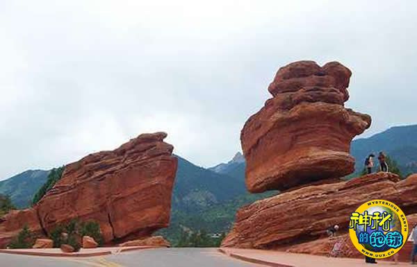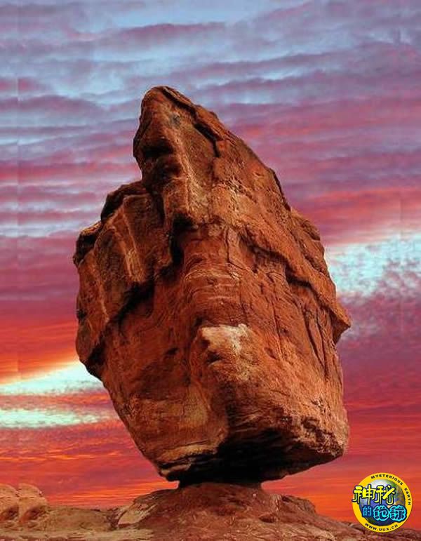 这块巨大的平衡岩座落于众神花园。众神花园位于科罗拉多州斯普林斯的派克峰附近,是一个已登记注册的国家天然地标。平衡岩赫然耸现在一条铺面交流道上方,赋予这里引人注目的景色。我们有必要提醒在这条道路上开车的人“小心驾驶”,否则的话,平衡岩可能就是他们最后看到的东西。最后一幅图片展现了构成平衡岩的砂岩层。在漫长的岁月变迁中,支撑平衡岩的狭窄底座不断风化,导致部分硬度较大的红色砂岩脱离较软的石阵。