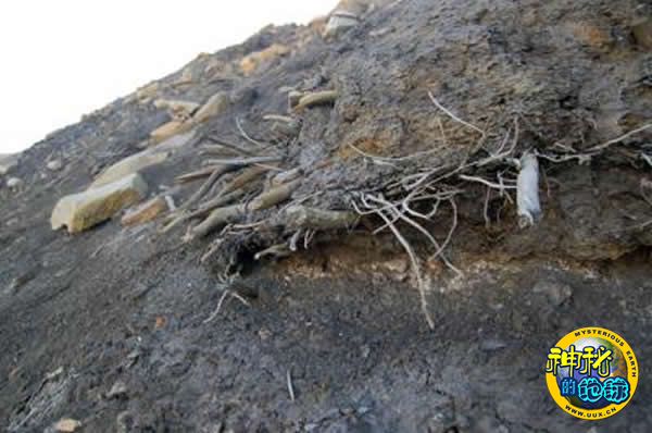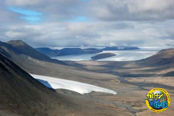 加拿大北极地区Ellesmere岛木乃伊化树木的原始露头。逐渐融化的冰川将这些树木暴露了出来。