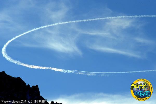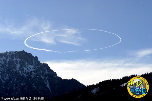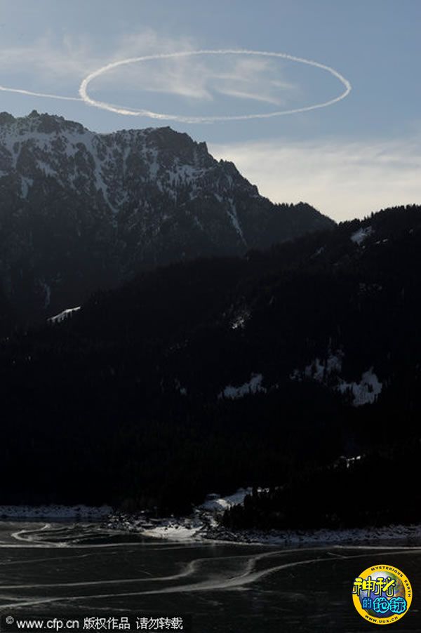 新疆天山天池西侧马牙山上空出现巨大云圈 来源: 蜘蛛网 时间:2010年12月18日 11:00 新疆天山天池西侧马牙山上空出现巨大云圈 新疆天山天池西侧马牙山上空出现巨大云圈 新疆天山天池西侧马牙山上空出现巨大云圈 2010年12月17日下午3时15分左右,新疆天山天池西侧马牙山上空出现一个大大的云圈,一架飞机拖着长长的“尾巴”有规则地划圆。飞机走后,形成的云圈随着风向自北向南飘移,15分钟后,云圈逐渐消失。 李明/CFP 上一篇 下一篇
