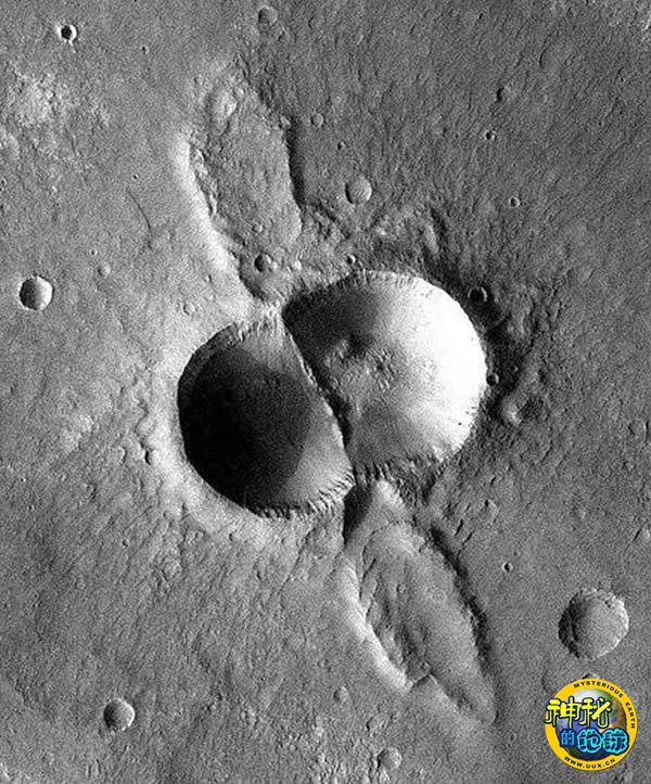 火星上的这个重叠陨石坑看起来就像是一个被箭穿透的苹果。这张图片是美国宇航局的“火星奥德赛”探测器在2005年5月拍摄的。每个陨石坑的直径都有几英里,这是由一颗陨石在落地前的很短时间内分裂成两个后,在地面撞击出来的两个碗状陨坑。普朗特表示,“火星奥德赛”一生比较幸运,没有遇到过真正的困难。但在2003年的万圣节期间发生过“最大危机”,一个“超级太阳暴”释放出大量带电粒子,对火星表面的所有电子设备都造成了巨大破坏。“火星奥德赛”上的辐射测量仪失灵,不过稍后它又恢复了正常。