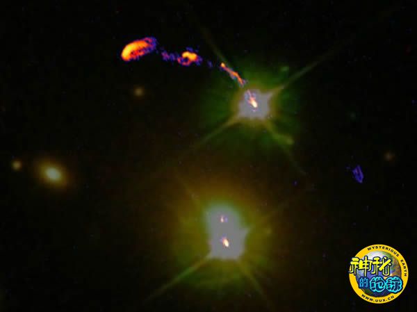 图。这是一张由广角e-Merlin射电望远镜和哈勃太空望远镜(光学)获得的双类星体的广视场合成图。在透镜效应的作用下,在图片上可以看到两个明亮的天体,一个位于另一个之上。e-Merlin望远镜发现的射电辐射是由星系中心的黑洞产生的。这张图片也显示出被认为是由位于起透镜效应的星系(前景星系)中心的黑洞产生的射电辐射。从图中可以看到,弧状射电喷射物正在快速离开上方的类星体。