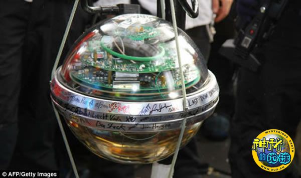 冰立方科学家手里捧着篮球大小的带有电缆的光感应器模块