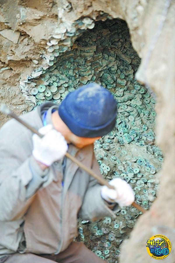 由于大量铜钱被清理后运走,钱窖形成了一个高约一米,长宽超过两米的大洞。一考古人员说,现在看来,钱窖的方向由原来的南北方向拐向西边,到底钱窖有多深目前还难估计。