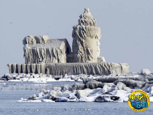 一座位于美国俄亥俄州克利夫兰港的灯塔在严寒和海水波浪的浇灌下,外面完全被冰层所覆盖,从远处望去,仿佛一座冰雪雕刻的中世纪古堡。
