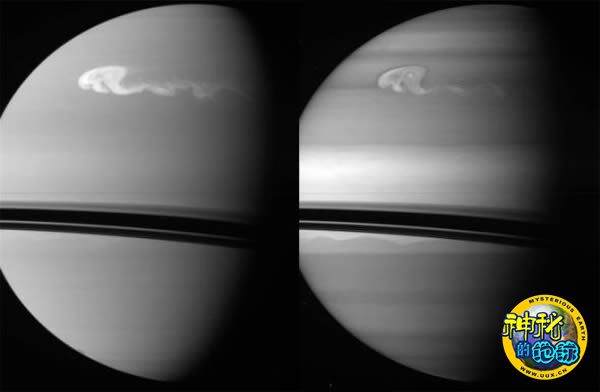 这个风暴呈现一个巨大的圆盘状云系,并且拖着长达数万公里的尾巴,横贯土星北半球。图像左侧栏中,采用了蓝光波段拍摄的图像揭示出这一尾巴结构的延伸范围;而右侧栏中的图像则使用了红外波段,显示出这一风暴系统核心部分的细节。这些图像的拍摄时间恰逢卡西尼号飞船从故障中恢复工作整整一个月。由于太阳耀斑产生的强烈带电粒子流影响,卡西尼号飞船于11月2日出现故障,停止工作,直到当月24日方才修复正常。