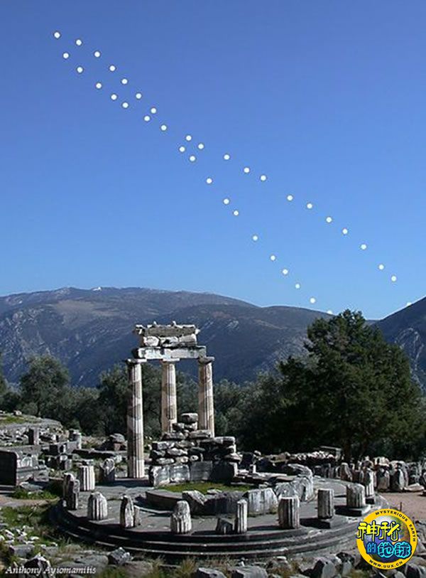 在这张2001年拍摄于希腊的太阳8字轨迹合成图上,太阳似乎从圆形神庙(Tholos)附近的山后升起。圆形神庙是特尔斐(希腊古都)城中雅典娜圣地的一座原型建筑。TWAN网站创始人塔夫雷什说:“传统太阳8字轨迹图都采用多次曝光设置,将相机放在固定平台上,用一张胶卷制作完成。而最新的太阳8字轨迹图制作方法则不同,是将数码相机放在固定平台上,每次拍摄一张照片,然后对所有照片进行合成。”