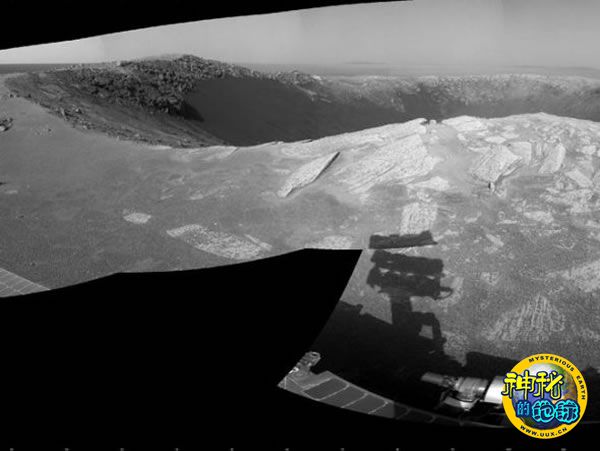 这张拍摄于2010年12月16日的360度全景照片所示,就是直径90米的圣玛利亚陨石坑。机遇号火星车用它的导航相机拍摄了一系列的图片,之后合成了这张照片。
