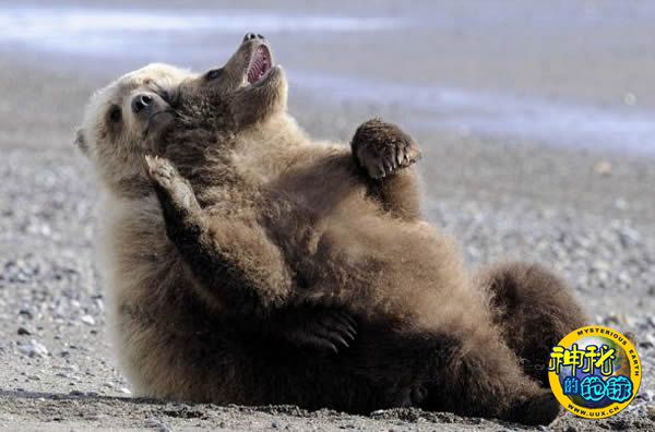 美国阿拉斯加州阿尔斯沃特港附近的克拉克湖国家公园,两只小棕熊正在海滩上玩闹打斗