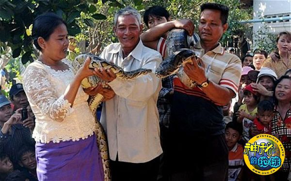 报道称,数百村民聚集在婚礼现场,见证一条16英尺长(约4.8米)、200磅(约90公斤)重的雌蟒与它的伴侣,一条体型略小的雄蟒间的结合。