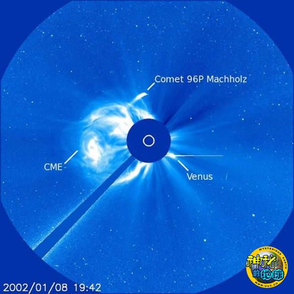 96P Machholz彗星。它每6年回归一次,到目前为止SOHO探测器已经三次见到它接近太阳。在这张照片中,CME指代“日冕物质抛射”,又称“日冕瞬变”。这是一种太阳外层大气局部出现的大规模快速物质抛射现象。 版权:NASA/ESA/SOHO