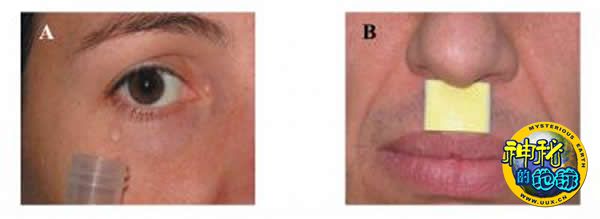 A. 为了要获得眼泪,捐赠的妇女在被隔离之下看悲伤电影,使用镜子来把眼泪捕获到一小瓶子裡。一个典型的捐赠含有〜1毫升。B.在连续进行的实验中,眼泪沉积到一个垫子,容许鼻腔的气流持续畅通,但不会经皮肤扩散。小组A和B是图示。