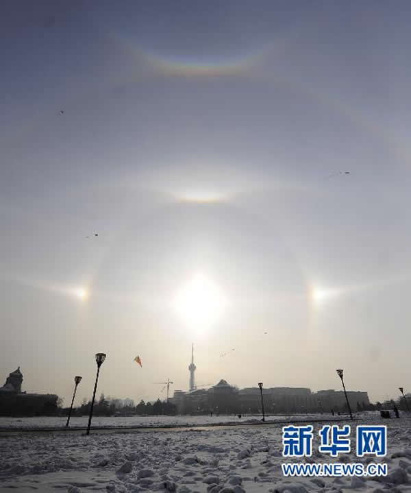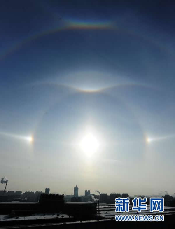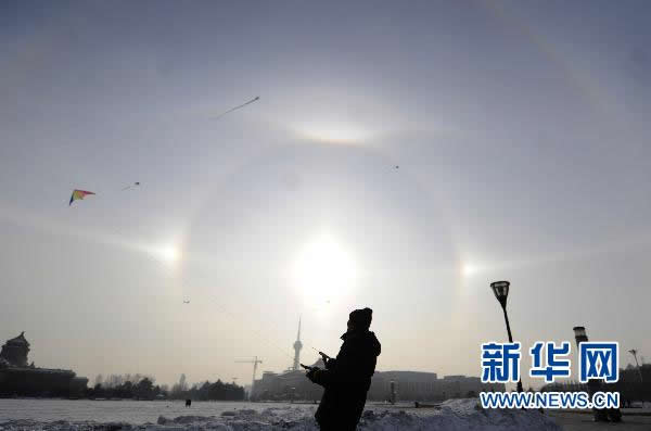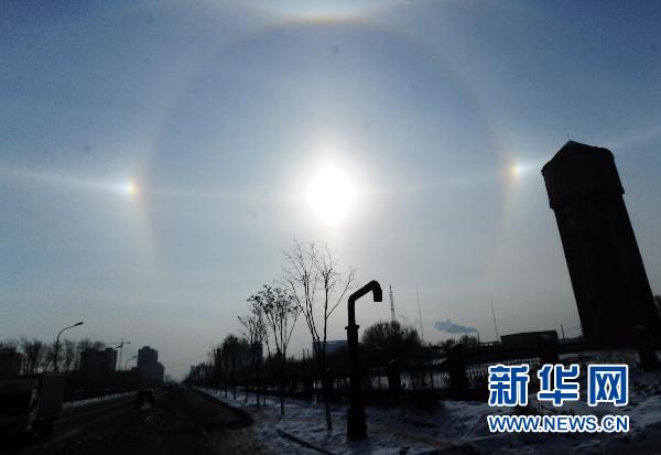 “快看,天空中出现了三个太阳!”长春市民薄凯文8日午后休息时忽然抬头望了望天空,立即作此感叹,并奔走相告。当日,许多长春市民都目睹了这一罕见的自然奇观。记者经过咨询得知,该现象为“幻日”。