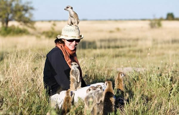 一只非常勇敢的猫鼬爬到娜塔莉·布拉德·卢卡斯的头顶上,把她当作“瞭望台”,为其他家族成员站岗放哨