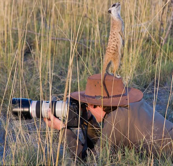 一只胆大包天的猫鼬爬到摄影师的帽子上,眼睛警惕的盯着四周,观察周围有没有天敌出现