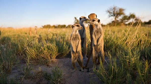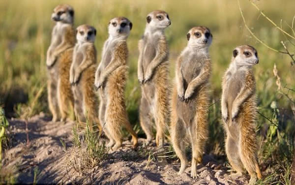 为了保护家人,避免它们被致命天敌吃掉,这些聪明的小家伙决定好好利用游客这个资源。猫鼬家族的每个成员都有明确分工,当一部分成员在洞穴附近寻找食物时,另一部分就要负责站岗放哨。它们后腿着地,前腿放在胸前,像人一样站立起来,观察周围充满危险的灌木丛,时刻警惕蛇和鹰等致命食肉动物。这些机警的动物经常站成一排,这样有助于它们更早发现危险,及时提醒家人。当危险出现时,猫鼬会快速躲到灌木丛或岩石附近的安全地点。