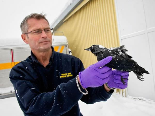 1月5日,瑞典救援机构主管克里斯特·奥洛夫森手里拿着一只掉到瑞典街头的死鸟(图片提供:Bjorn Larsson Rosvall)