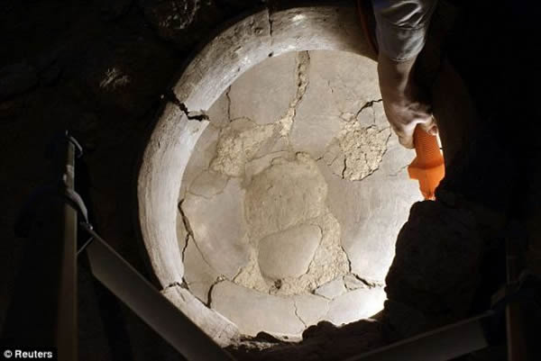 手电筒照亮了用以压榨葡萄的大缸内部。化学家在大缸内壁发现了植物色素二甲花翠素的证据。缸底则覆盖着灰黑色的有机残留物