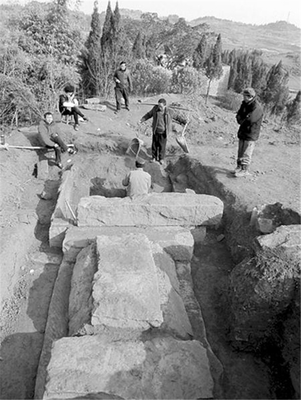 考古人员最先只发现了4个墓室,1号至3号古墓呈“品”字形紧凑布局。1号墓道中发现一块残碑,上有“张氏孺”的隶书字样,推测应为“张氏孺人”。