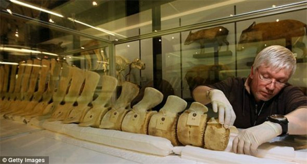 该博物馆哺乳动物馆长理查德·萨宾正在对骨架做最后的调整。科学家发现这头鲸的年龄可能不超过11岁