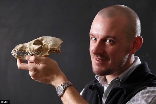 研究人员塞缪尔·贝克纳普三世与家狗头骨合影留念。发现犬骨碎片化石时,他正对风化的人类粪便进行分析