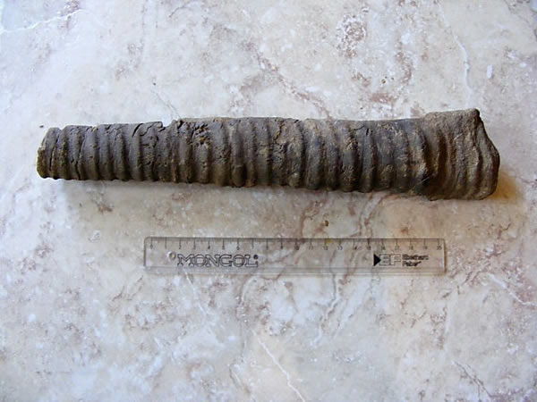 这块化石标本长32厘米(12.6英寸),直径5厘米(2英寸),在其下部还有特殊的环状纹饰。