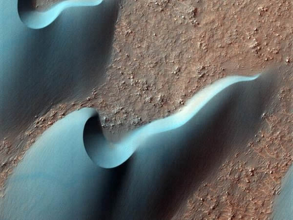 美国国家地理一周精彩太空图片:猎户座星云 来源: 蜘蛛网 时间:2011年1月25日 11:10 3.蓝色沙丘 蓝色沙丘(图片来源:University of Arizona/NASA) 照片由火星侦察轨道器拍摄,展现了一个火星陨坑内的新月形沙丘,好似一把装饰精美的匕首。这种沙丘的一大特征是,两个下风向“角”之间的面较为陡峭。在这幅照片中,东南风沿着火星南半球阿尔汉格尔斯克陨坑多岩底部移动,影响沙丘的形状。 上一页1234567下一页 上一篇 下一篇
