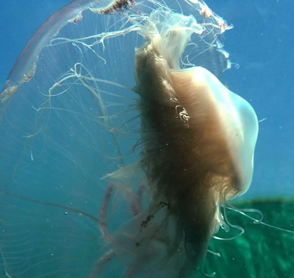 发现于佛罗里达群岛的Drymonema larsoni水母正在实验室的水箱里游着。根据最新的分析,墨西哥湾的Drymonema物种与它的地中海近亲D. dalmatinum基因上有所区别。先不考虑它们居住的环境,所有的Drymonema物种都喜食海月水母,而且几乎都以成年水母为食。“它们展开自己的触角,只要它们碰到了一个海月水母,就会有越来越多的触角将其团团围住,最后将之吸进来。” 多芬岛海洋实验室的拜哈解释道。