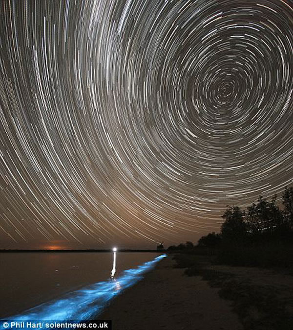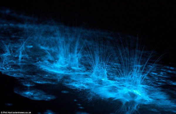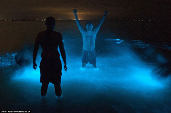 拍摄这组照片的是摄影师菲尔-哈特,当他的朋友在漆黑夜晚浮出湖面时全身呈明亮的蓝色荧光,他说:“从照片上看好像我们是用放射性涂料涂在身体,但事实上并非如此。”这种荧光是由生物体发光化学反应形成的,通常自然出现于微生物在水中受到骚扰。