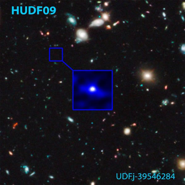 这张图像所示的就是此次发现的,可能诞生于宇宙诞生,即大爆炸之后仅4.8亿年时的星系,其红移值高达10.3。图中标示出了它在哈勃超深场(HUDF)图像中的位置。哈勃超深场是迄今在红外波段获取的最遥远星空图像。