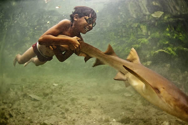 “叫伊纳尔(Enal)来吧!”其中一个建议道,“他比我们都要熟悉鲨鱼。”不一会儿,只见一个幼小却矫健的身影一路飞奔而来,阳光在他黝黑的胴体上勾勒出一圈金边。他就是伊纳尔,只见他一头扎进碧蓝的海里,如鱼得水一般地摆动着身体,很快游到了小鲨鱼附近。伊纳尔像招呼一个老友一样拍了拍鲨鱼的身子,并抓住了它的尾巴。