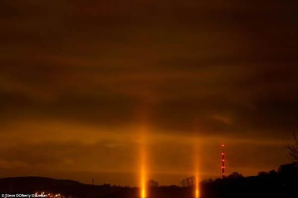 英国小镇夜空中出现两道由冰晶形成的橙色光柱