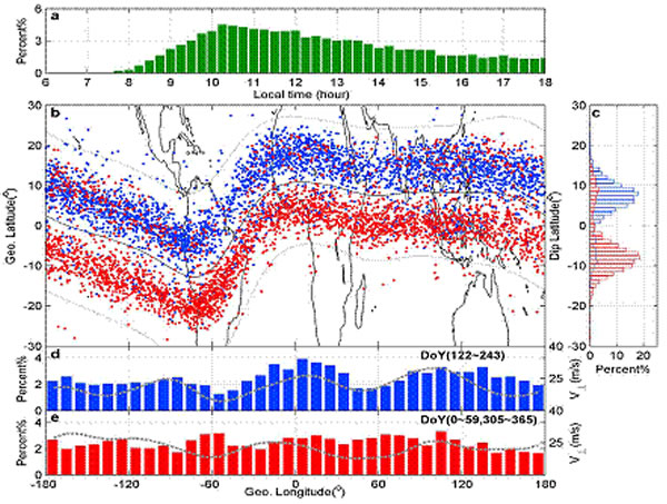 地质地球所地磁与空间物理研究室赵必强副研究员等人利用美国COSMIC星座观测系统中掩星反演技术获得的近250万个电离层剖面对电离层分层结构进行了研究。通过求取电子浓度剖面的高度梯度的变化并统计出现双层结构的出现率,首次给出了电离层分层结构的纬度和经度变化性。揭示了如下特征:1)分层结构主要集中在低纬度区域,且低纬电离层分层结构出现最大值为夏季半球的磁纬7-8度位置;2)夏季电离层分层结构的经度变化与DE3潮汐所调制电离层诸多参量变化WN4结构具有相似性;3)分层结构出现的地方时最大在日出以后10:00-12:00之间,与地面测量的统计结果一致。卫星测量和地面观测统计结果的一致性验证了掩星反演技术在反映电离层精细结构上具有相当的可靠性。