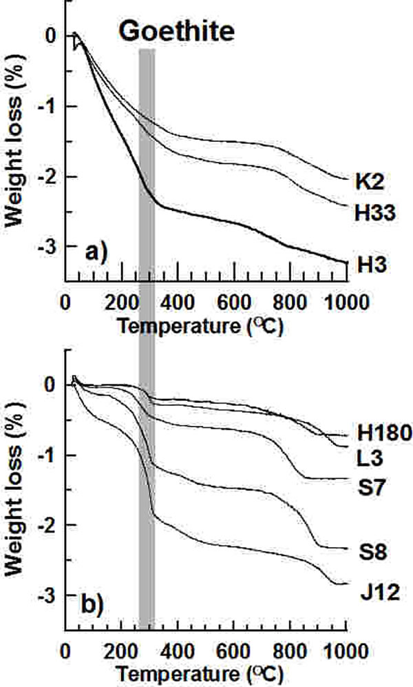 两类具有不同形状的赤铁矿的热重分析(a) 立方体;(b) 非立方体;阴影部分表示针铁矿的影响