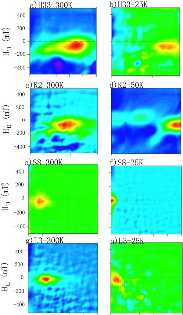 具有不同形状赤铁矿的低温和高温FORC图(a-d)立方体样品;(e-h)非立方体样品 等值线的中心点向右表示矫顽力高,显然这两类样品具有完全不同的矫顽力分布