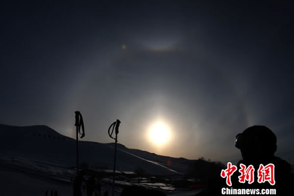 (蜘蛛网www.eeook.com)2月8日,新疆阿勒泰市将军山滑雪场上空出现了罕见双日晕奇观,灿烂的阳光周围双层的光圈清晰可见,让前来滑雪的游客大饱眼福。(蜘蛛网www.eeook.com)