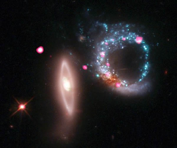 螺旋星系(右)与椭圆星系相撞掀起了一股恒星形成潮。在哈勃太空望远镜拍摄的可见光照片中,蓝色区域便是新形成的恒星。一些大质量恒星寿命较短,年轻时便夭折,死亡后形成黑洞。黑洞在吞噬周围物质时会释放出X射线,也就是钱德拉X射线望远镜所拍照片的粉红色区域。